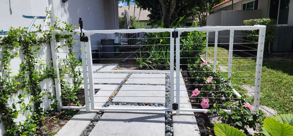 Modern Concepts provided custom aluminum railings with premium stainless steel cable infill and marine-grade hardware for this luxury waterfront residence in Boca Marina, East Boca Raton. The project included a custom double swing pedestrian gate offering secure access to the Intracoastal dock, engineered for durability in harsh coastal environments. A matching aluminum balcony railing system completes the design, delivering modern coastal aesthetics, unobstructed water views, and high-end custom metal fabrication built to Florida building code standards.